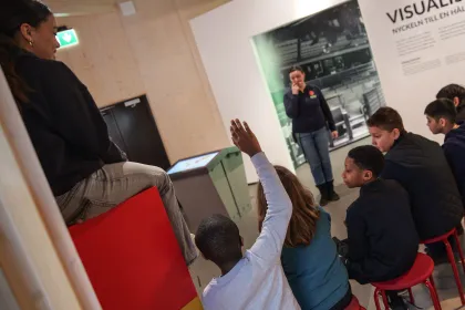 Sabina Birgersson är pedagog på Universeum och lotsar klassen genom huset. Allt eftersom övergår den initiala försiktigheten till diskussion.